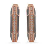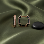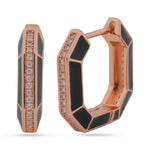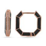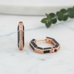 Define your style with these striking geometric hoop earrings. Crafted from hypoallergenic 925 sterling silver and finished with a rich rose gold polish, they feature bold black enamel panels and sparkling micro-pave stones. Their sleek, octagonal design offers everyday durability and versatile evening glamour. Elevate your essentials.