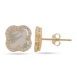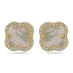 Adorn yourself with timeless elegance. These exquisite clover stud earrings feature genuine Mother of Pearl, encircled by brilliant simulated diamonds. Crafted from hypoallergenic 925 sterling silver with a radiant polished gold finish for lasting shine and comfort. Perfect for daily wear or elevated occasions. Experience luxury, effortlessly.