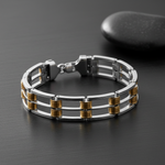 Elevate your style with the Monarch bracelet. Crafted from luminous 925 Sterling Silver with a radiant polished finish and striking gold-tone accents. Its intricate, durable segmented design offers unparalleled style and comfort. Hypoallergenic and built to last, it's the perfect versatile statement for any occasion, from boardroom to evening wear.