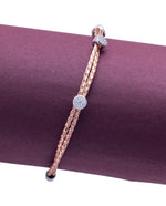 This dainty adjustable bracelet features a fine rose gold-tone braided cord with a beautiful texture. It is accented by small, polished metallic charms, including one central charm with a clear, sparkling stone detail. The secure lobster clasp and extension chain ensure a comfortable, customizable fit. Perfect for layering or as a subtle standalone piece.