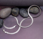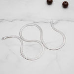 Discover the brilliance of our Braided Herringbone Necklace. Crafted from 925 Sterling Silver, this wide flat chain features an intricate woven texture that catches light from every angle. Hypoallergenic and fluid, it offers a diamond-cut sparkle with a silky, liquid drape.