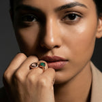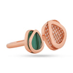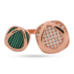 Discover the Veridian Compass Ring. Crafted in polished 925 Sterling Silver, this rose gold-plated open-cuff design features two bold geometric stations: one with a captivating, striated green stone and the other shimmering with brilliant pavé crystals. Hypoallergenic and durable, it's a versatile statement piece for the modern connoisseur.