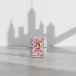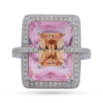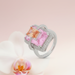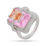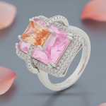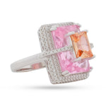 Make a vibrant statement with the Duo-Tone Radiant Halo Ring. This magnificent piece features asymmetrical, rectangular-cut pink and peach simulated gems set in dazzling 925 sterling silver with a brilliant pavé halo. The polished, hypoallergenic design guarantees comfort and lasting shine, making it the perfect cocktail ring for the modern connoisseur. Indulge in colorful luxury today.