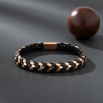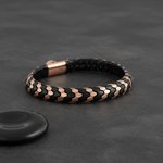 Introducing the Chevron Bangle, a textural masterpiece in $925$ sterling silver. The flexible design features interlocking links plated in radiant Rose Gold Vermeil and deep Black Enamel, creating a mesmerizing scale pattern. Hypoallergenic and durable, this piece offers a high-fashion, snake-like elegance. Secured with a seamless box clasp for comfort and luxury that lasts.