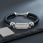 Experience unparalleled elegance. This striking 925 sterling silver bracelet features a sophisticated braided black leather band and a magnificent bar setting pavΓ©-set with brilliant, simulated diamonds. Hypoallergenic and meticulously polished for lasting shine. A statement piece perfect for the discerning individual. Elevate your everyday style or make an unforgettable gift.