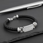 Experience unparalleled elegance. This striking 925 sterling silver bracelet features a sophisticated braided black leather band and a magnificent bar setting pavΓ©-set with brilliant, simulated diamonds. Hypoallergenic and meticulously polished for lasting shine. A statement...