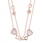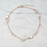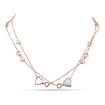 Capture pure romance with this elegant heart shape MOP Sterling Silver station chain necklace. The delicate double chain, finished in luxurious rose gold, is adorned with alternating open and Mother of Pearl-inlaid heart charms. Crafted from hypoallergenic 925 silver, it delivers a durable.