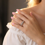 Introducing the chic Enamel Bobble Band. Crafted from 925 sterling silver with radiant rose gold plating, this wide ring features striking black and white enamel segments, elegantly framed by decorative bobble accents. Its bold, modern stripe design offers versatility and hypoallergenic comfort. A luxurious statement piece that transitions effortlessly from day to evening.